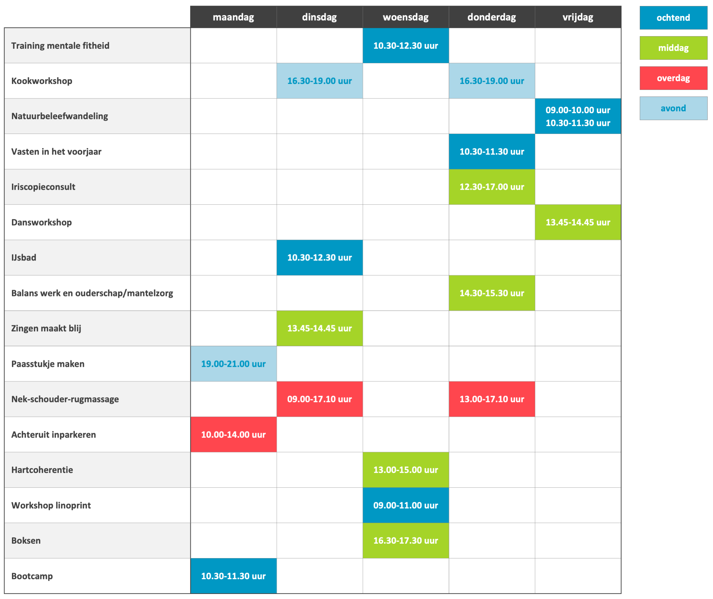 Deze week kun je allerlei activiteiten en workshops doen, die zowel ontspannend als leerzaam zijn. De hele week staat in het teken van bewegen, ontspanning, mentale weerbaarheid en werk-privé-balans. Het doel: elkaar inspireren en ondersteunen in het ‘sterk in je werk’ voelen én staan.